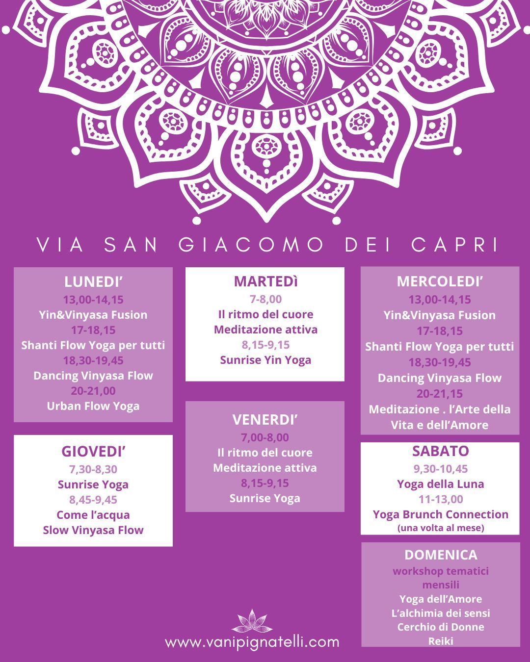 Le Classi Collettive e Private di Yoga sono disponibili dal Lunedì al Sabato. Contattami per scoprire la classe più adatta, prenotare una lezione privata o la tua classe di prova gratuita.