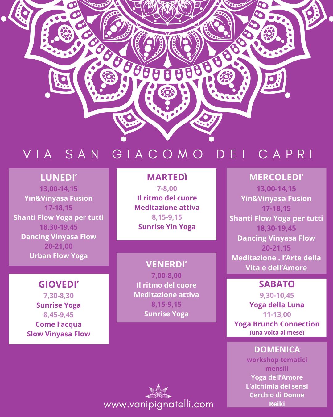 Le Classi Collettive e Private di Yoga sono disponibili dal Lunedì al Sabato. Contattami per scoprire la classe più adatta, prenotare una lezione privata o la tua classe di prova gratuita.